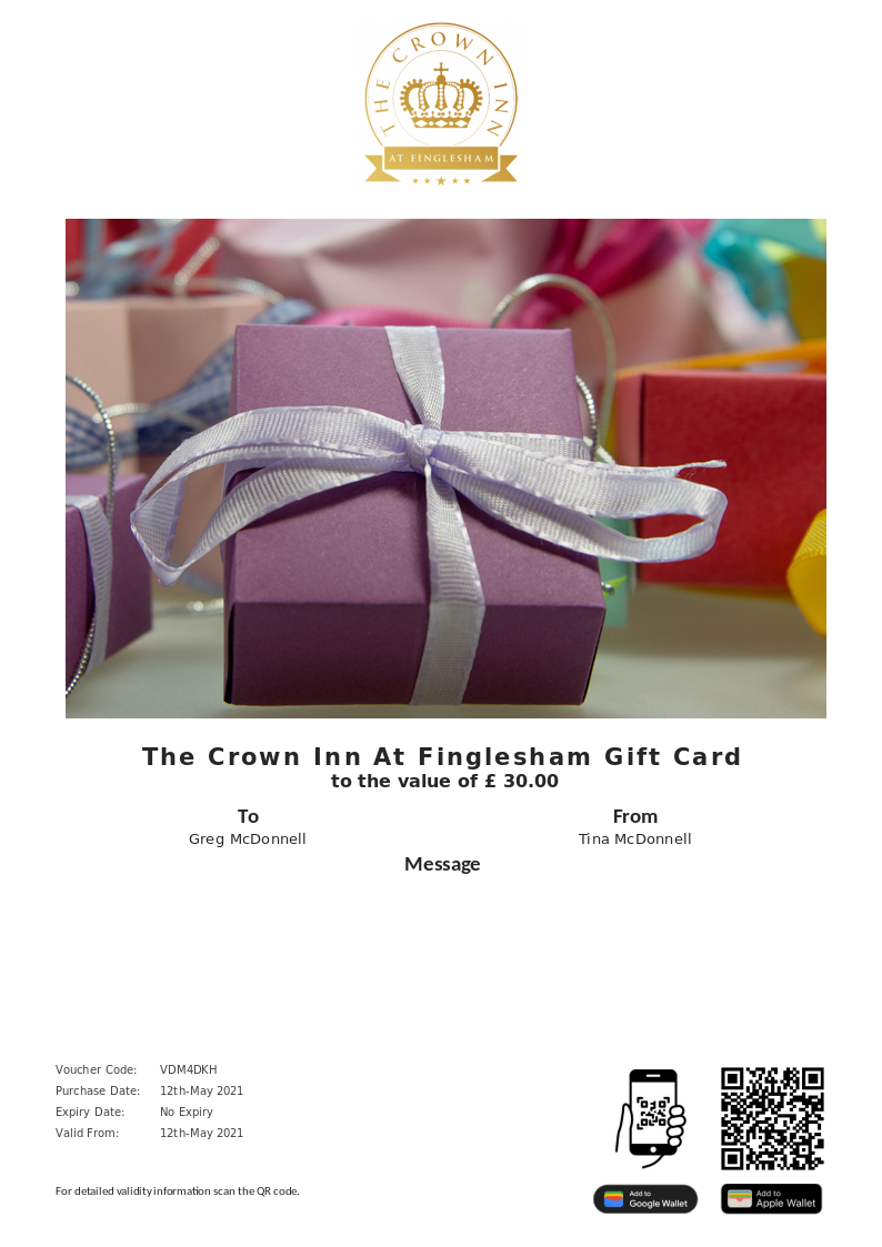 The Crown Inn At Finglesham allows you to purchase instantly printable gift vouchers, special offers and tickets using the Voucher Connect platform.